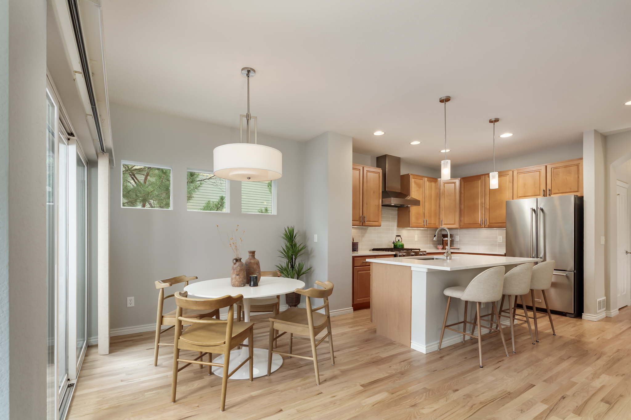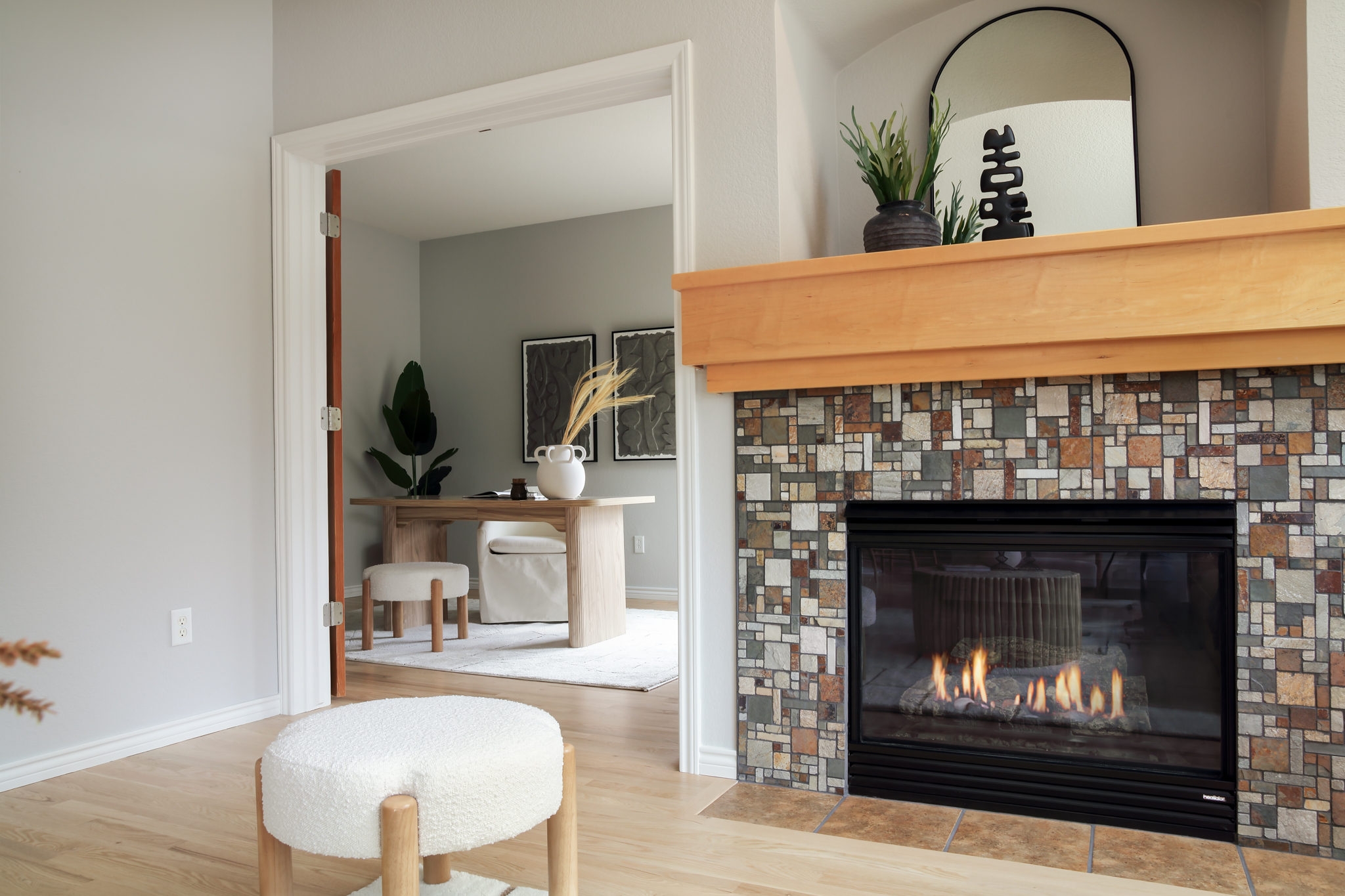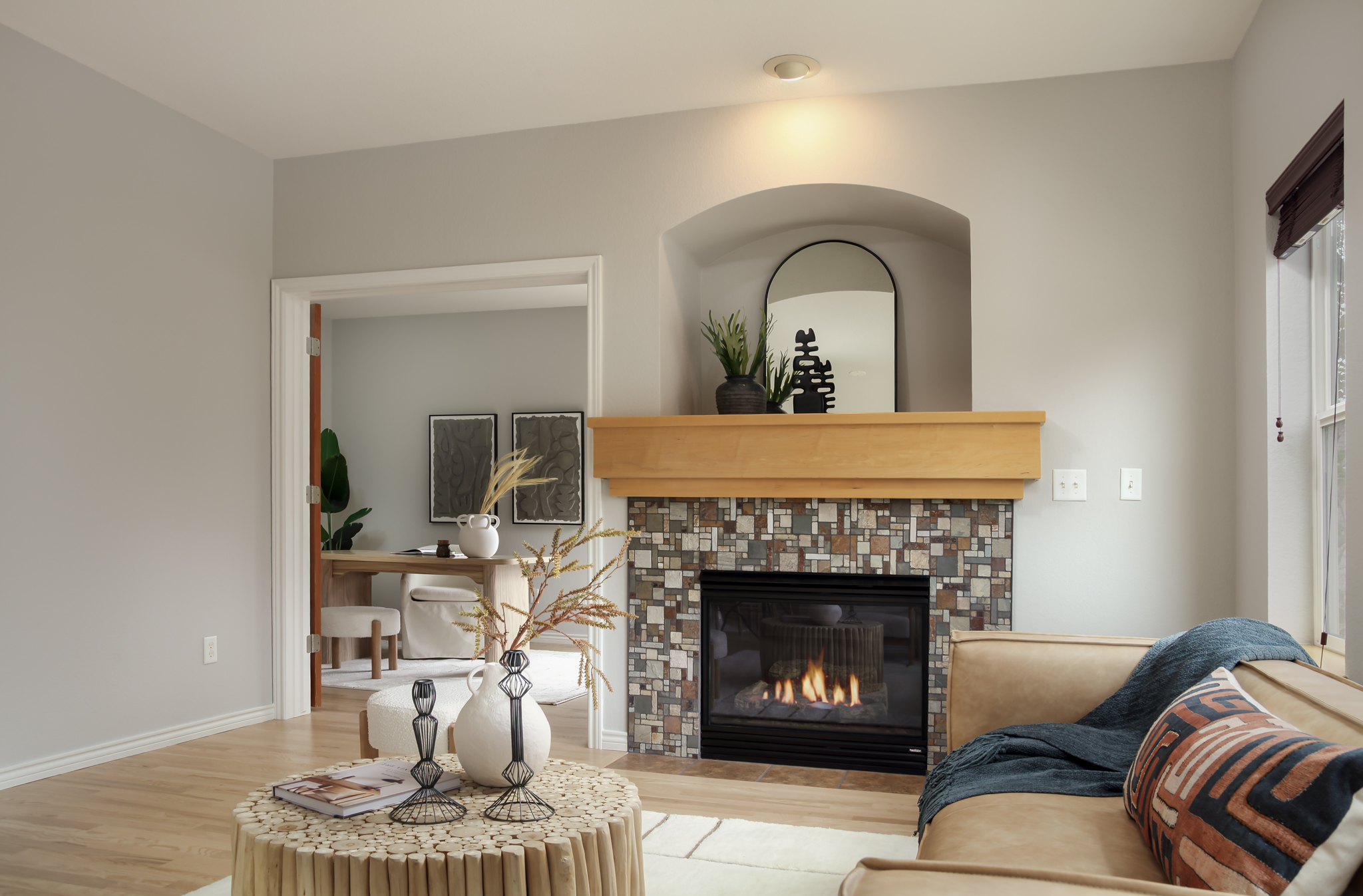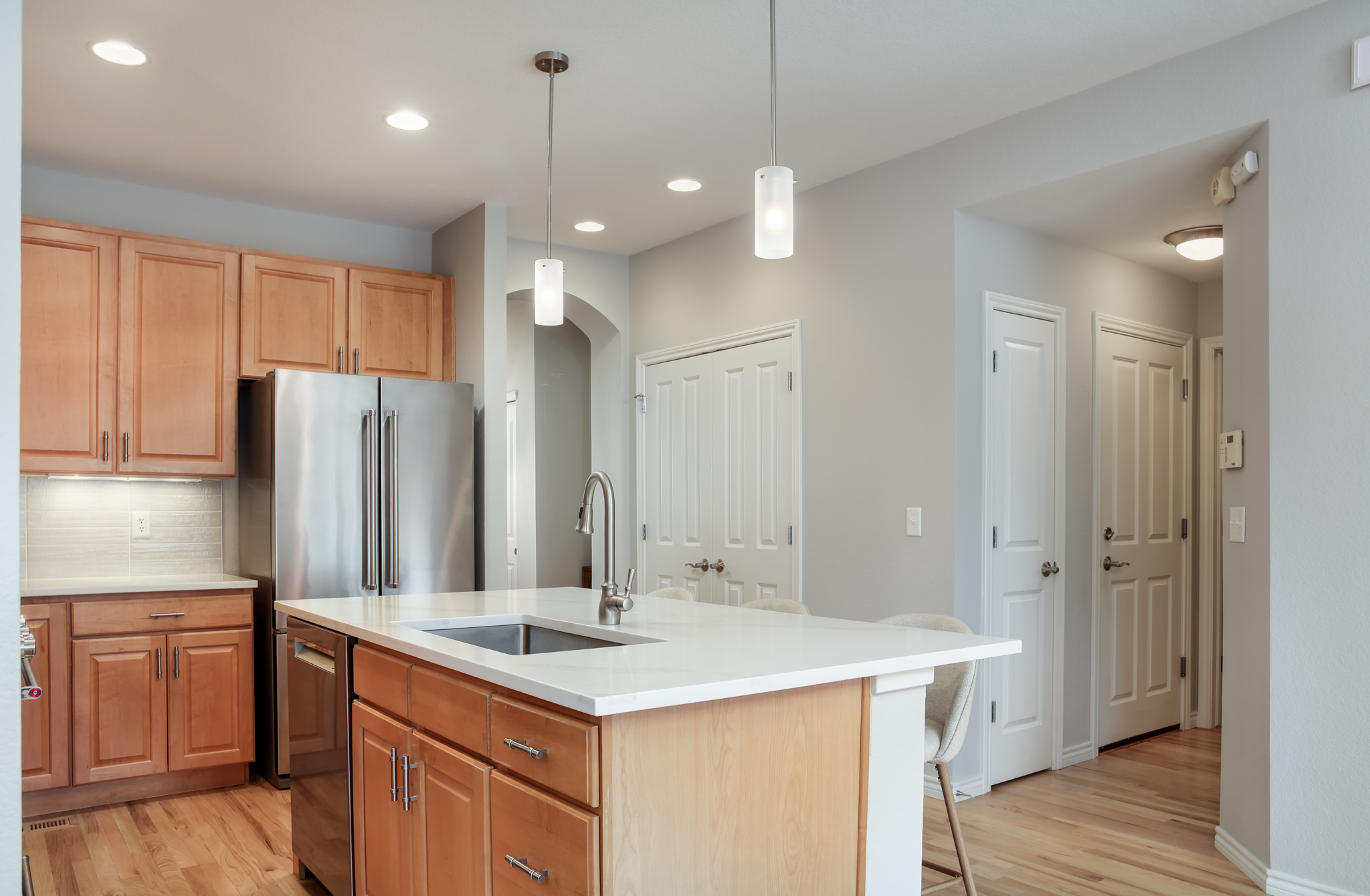 The main level is open and bright with new hardwood floors throughout. The kitchen anchors the space with quartz countertops, a KitchenAid and Bosch appliance package, gas range with stainless hood, island, and pantry. All interior lighting has been upgraded. Modern pendant lighting in the kitchen and a chandelier in the dining area reinforce the updated feel. An office off the living room closes off behind French doors when you need it to. Full-size washer and dryer on the main level. Fresh paint inside and out.