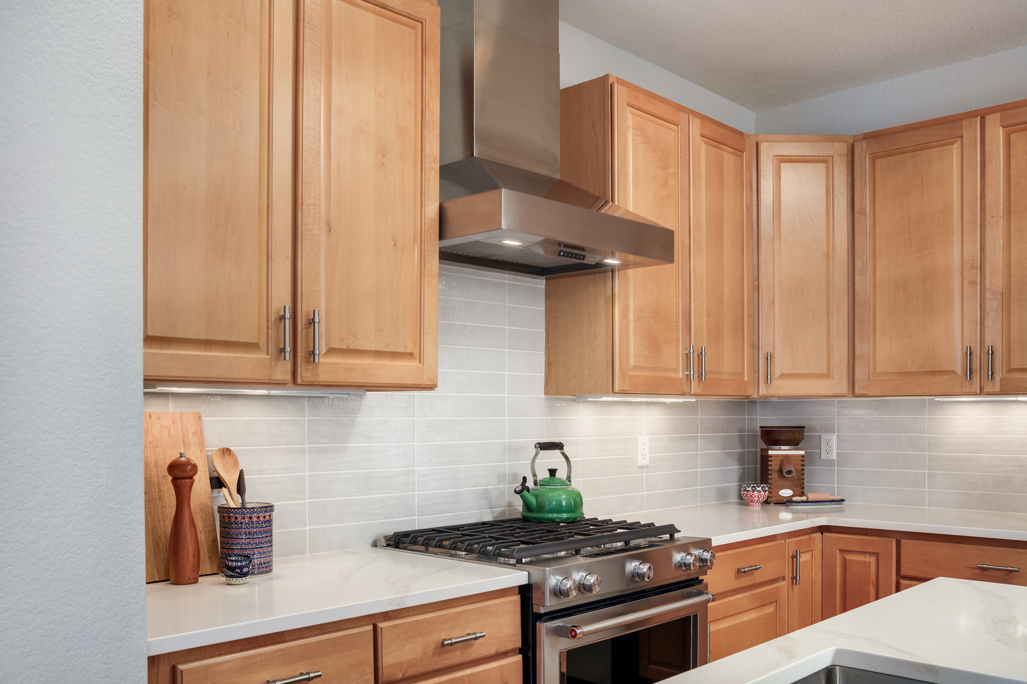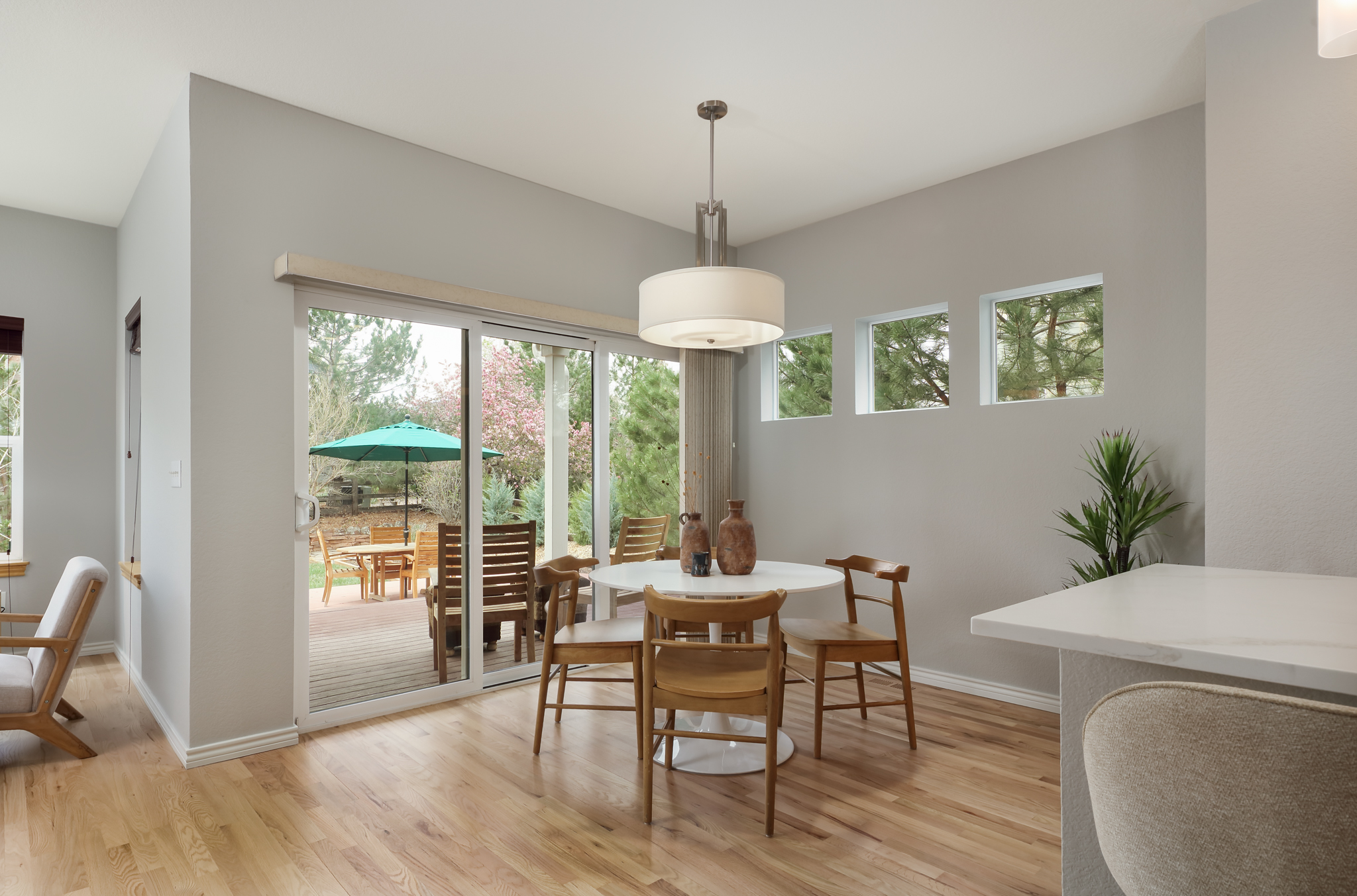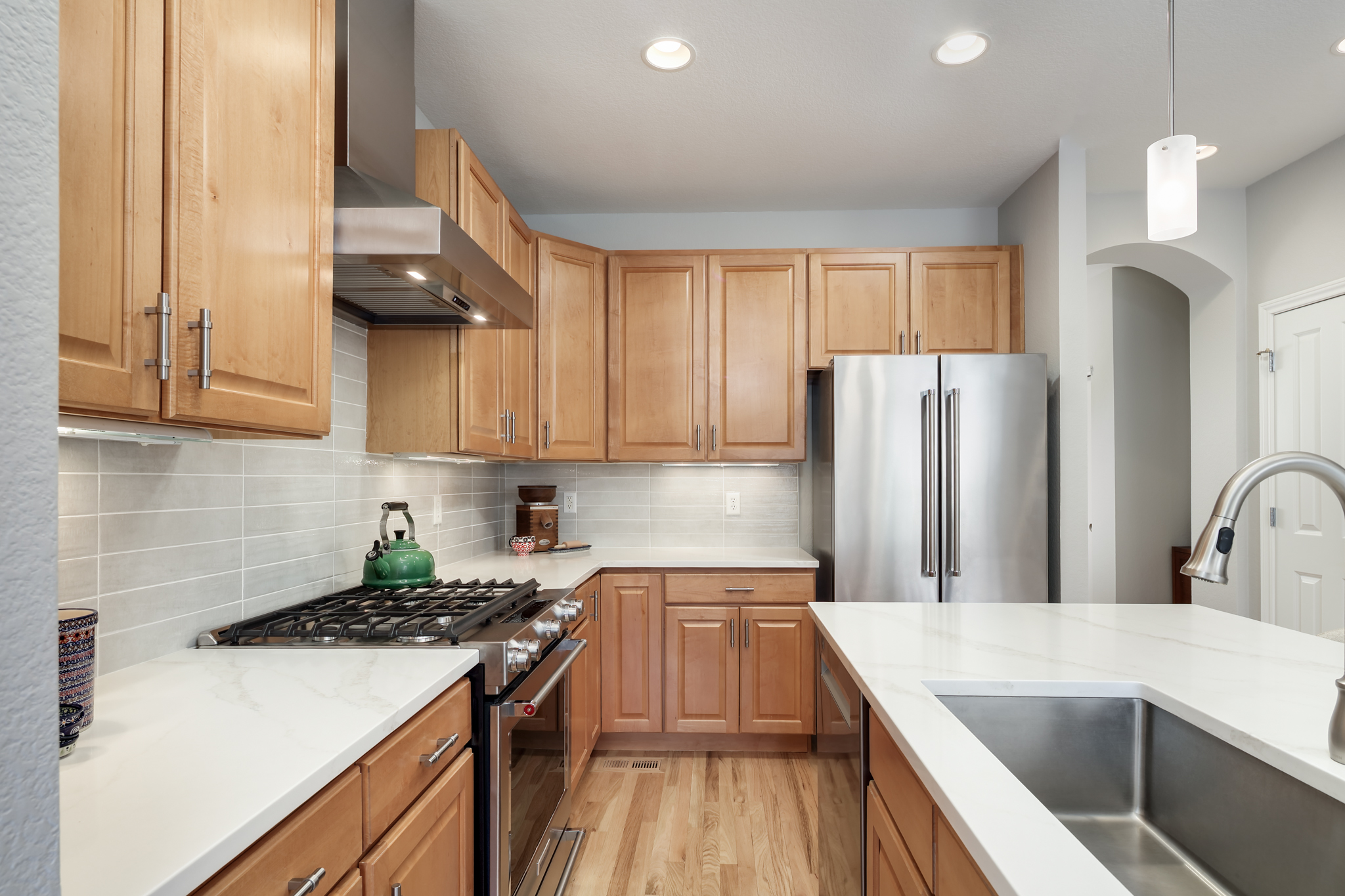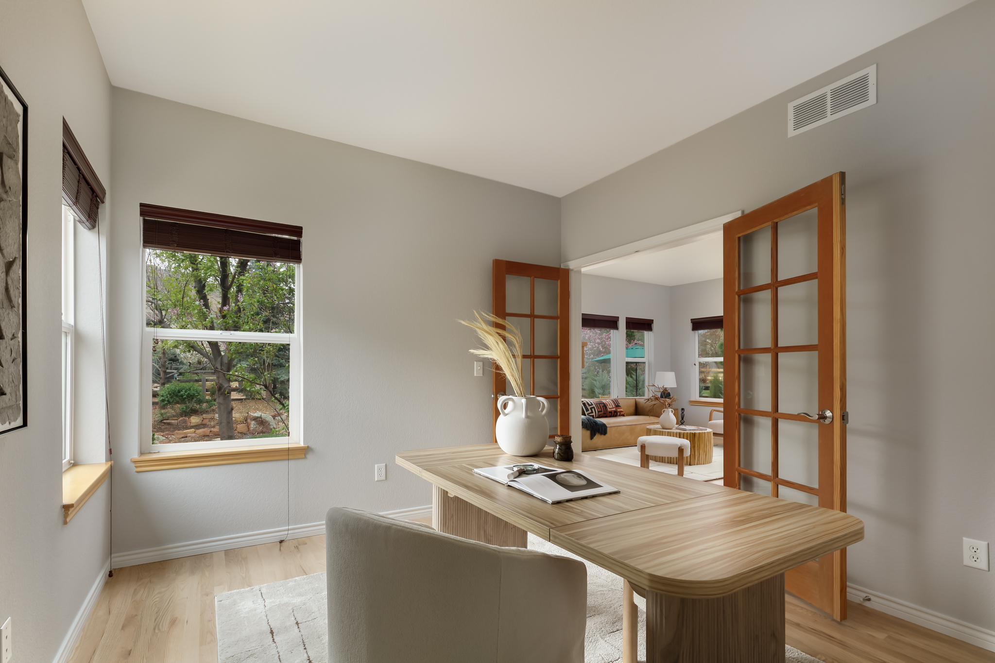 The main level is open and bright with new hardwood floors throughout. The kitchen anchors the space with quartz countertops, a KitchenAid and Bosch appliance package, gas range with stainless hood, island, and pantry. All interior lighting has been upgraded. Modern pendant lighting in the kitchen and a chandelier in the dining area reinforce the updated feel. An office off the living room closes off behind French doors when you need it to. Full-size washer and dryer on the main level. Fresh paint inside and out.