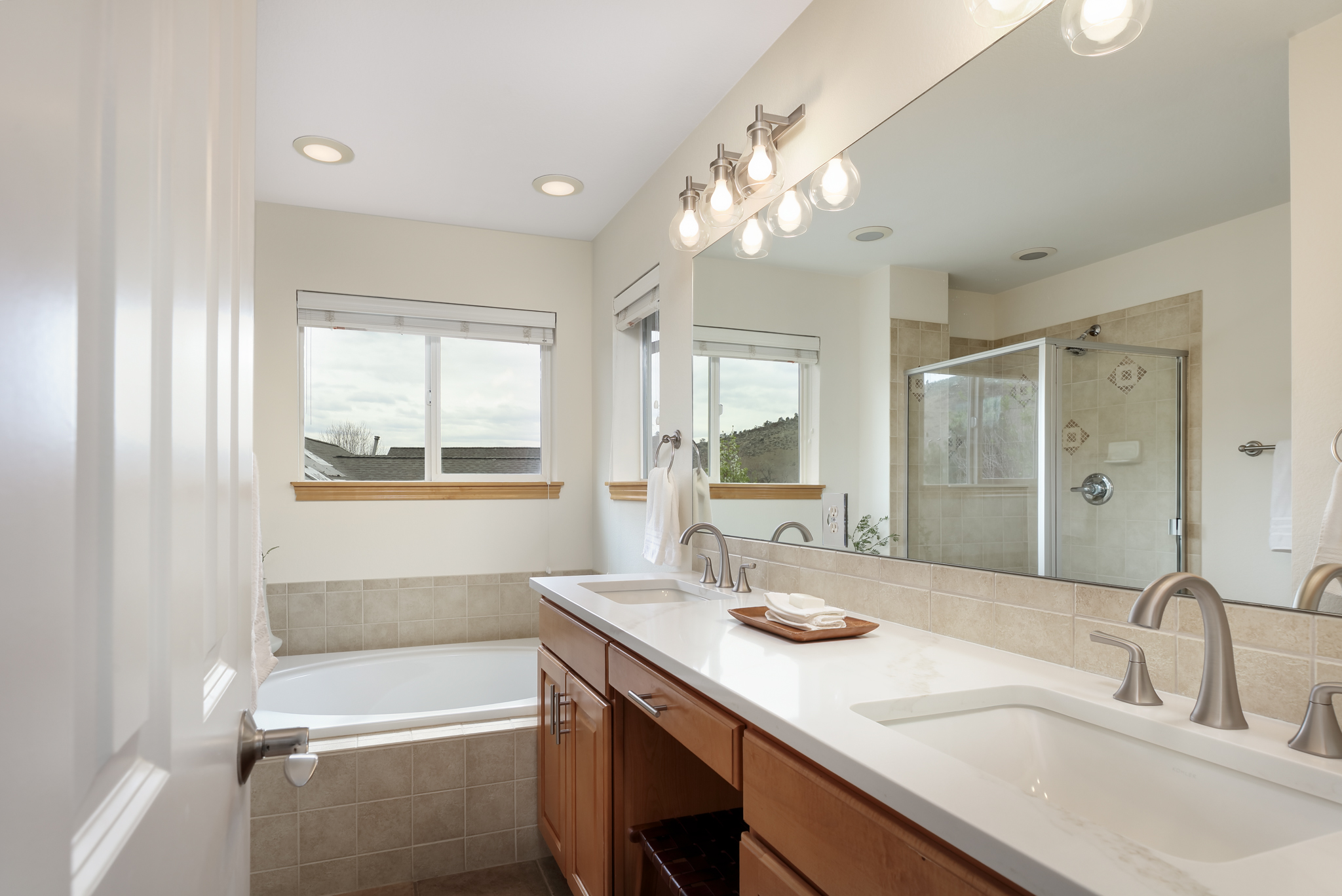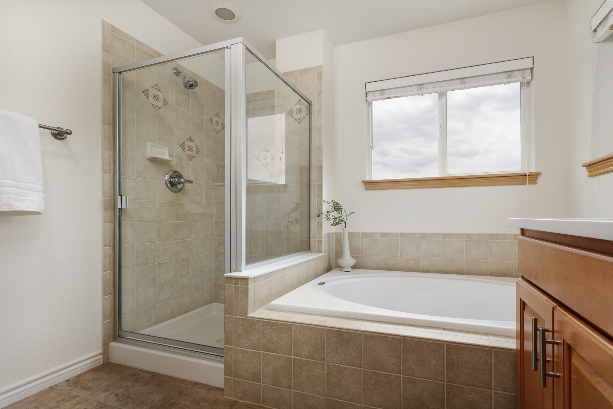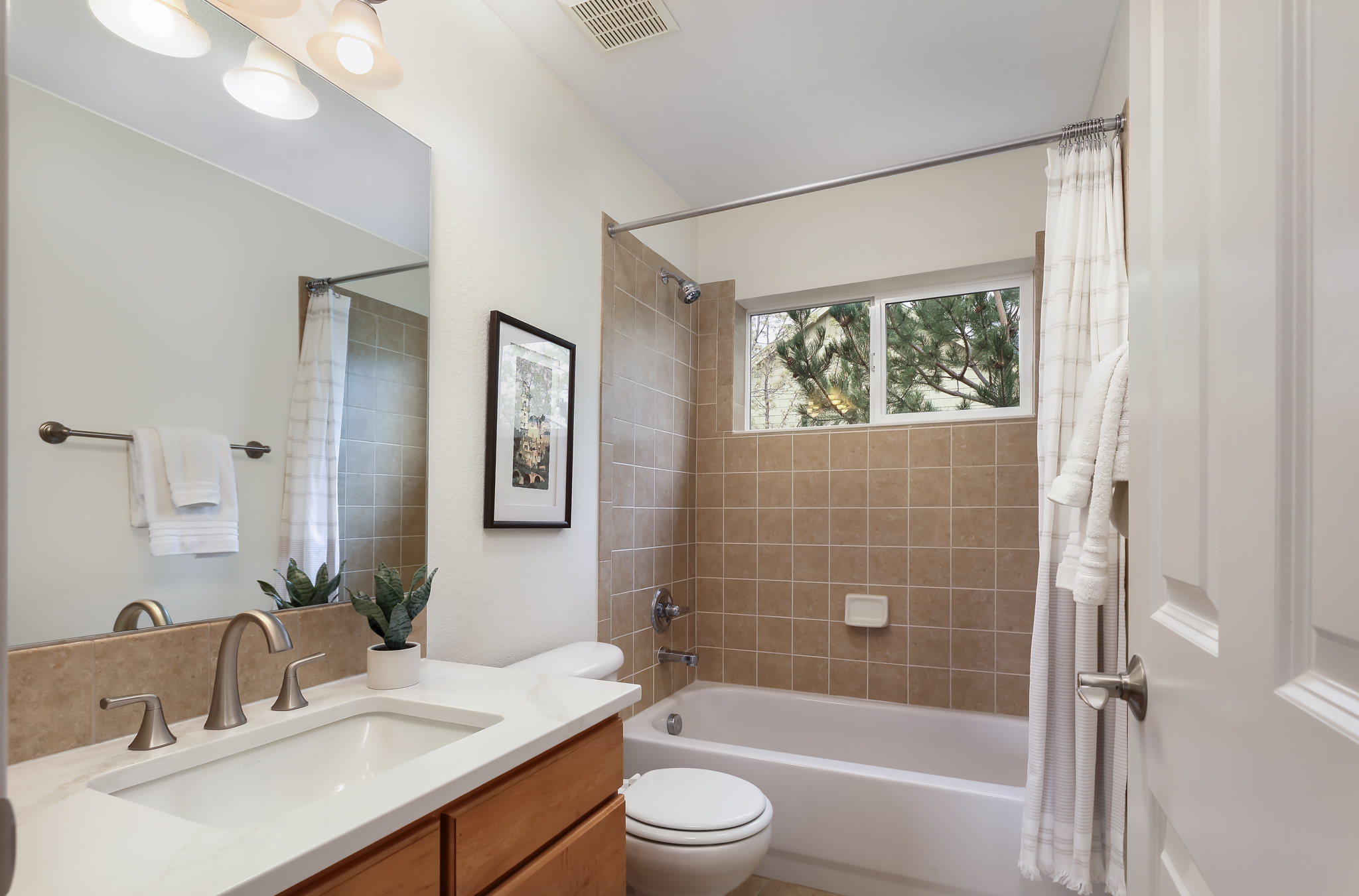 Three bedrooms upstairs, all generous, all with new carpet. The primary suite has a vaulted ceiling, walk-in closet, and a five-piece bath with new quartz counters across a dual vanity with Kohler fixtures, a deep soaking tub, and separate shower. Guest bathrooms also have new counters and fixtures.