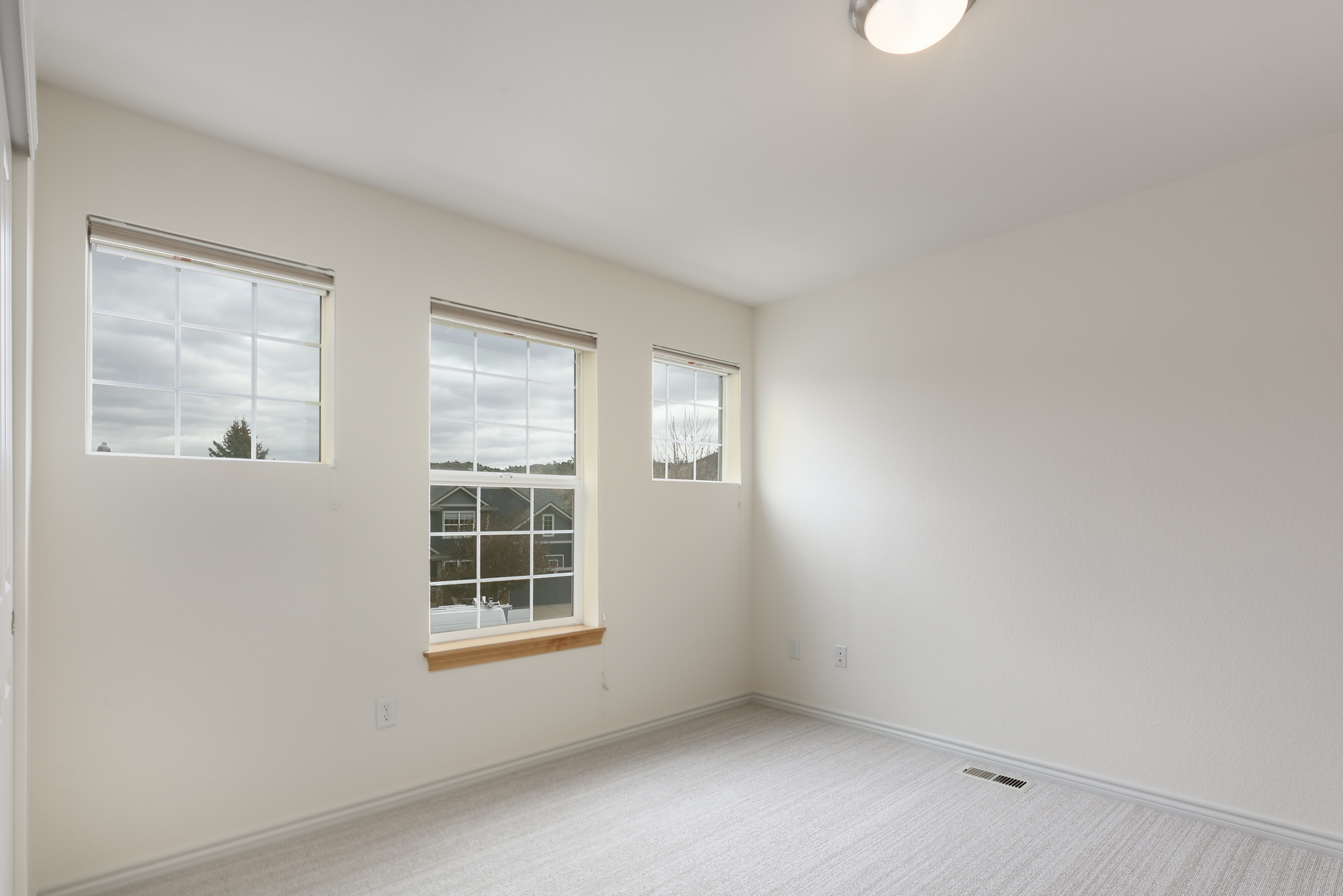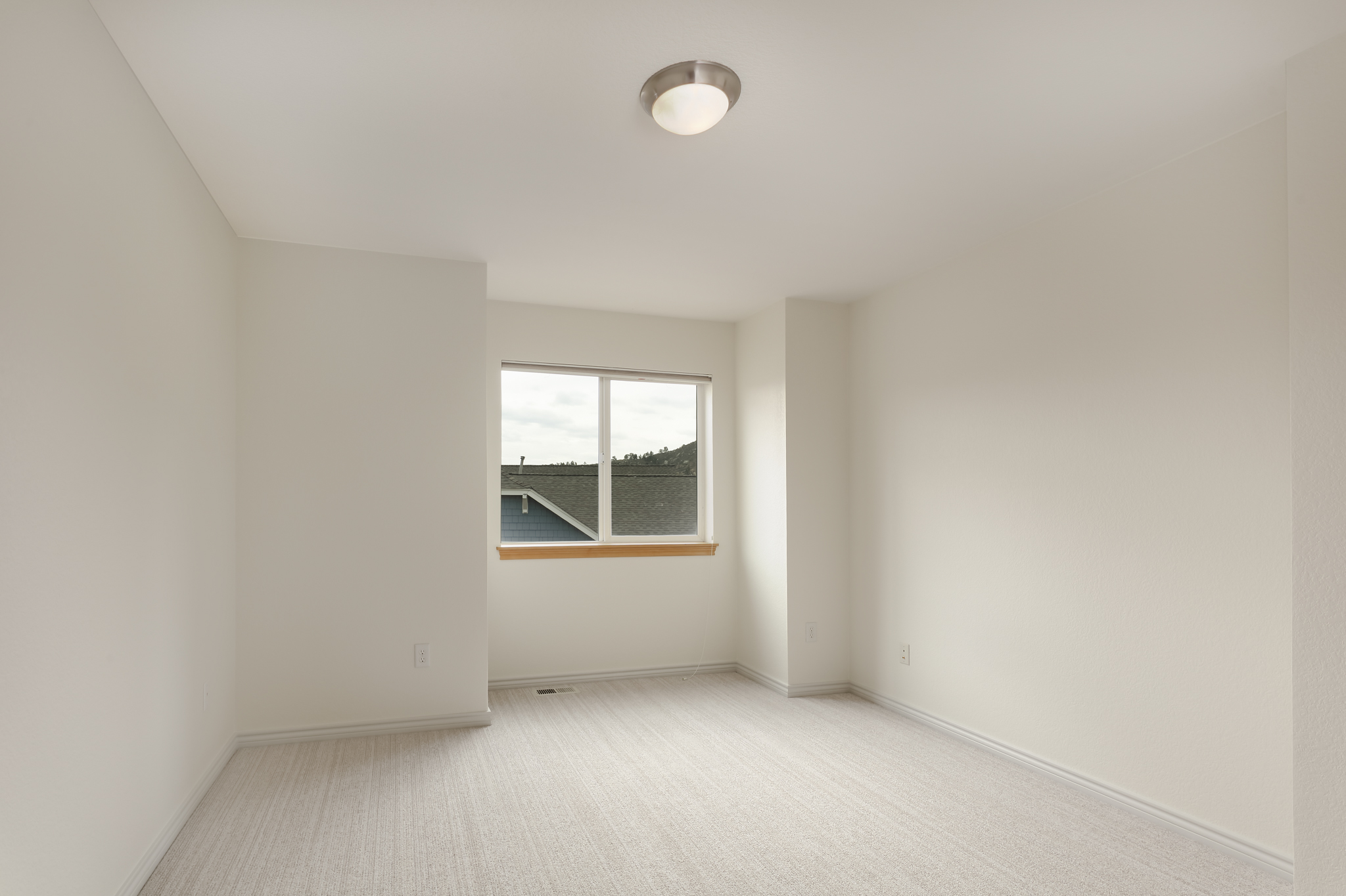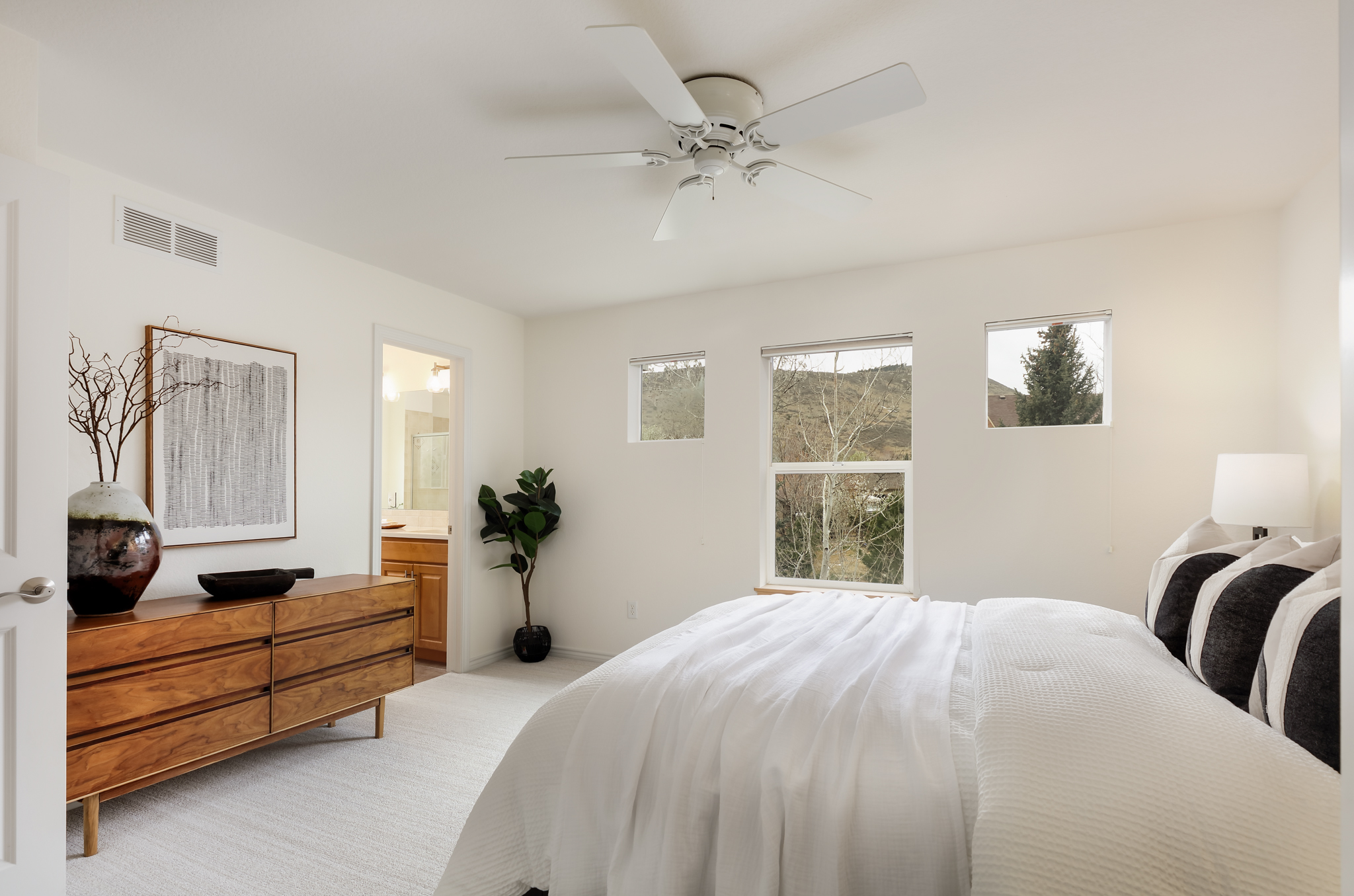 Three bedrooms upstairs, all generous, all with new carpet. The primary suite has a vaulted ceiling, walk-in closet, and a five-piece bath with new quartz counters across a dual vanity with Kohler fixtures, a deep soaking tub, and separate shower. Guest bathrooms also have new counters and fixtures.