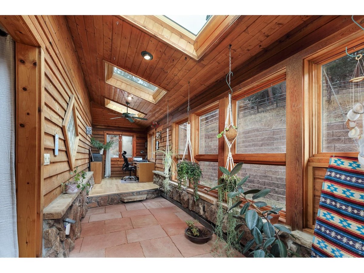 There are moments in the home that feel entirely their own. A tavern-style bar, built with log siding, reclaimed brick, and sandstone, creates a space that leans more gathering place than feature. Nearby, an indoor atrium, currently used as an office, introduces a year-round presence of green into the interior. An enclosed sunroom adds additional square footage that can shift with the seasons or the needs of the day.